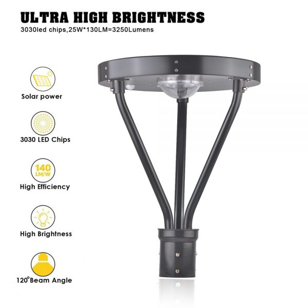 LED Post Light Solar 25W IP65 5000K with 3,000Lm for Courtyard lighting
